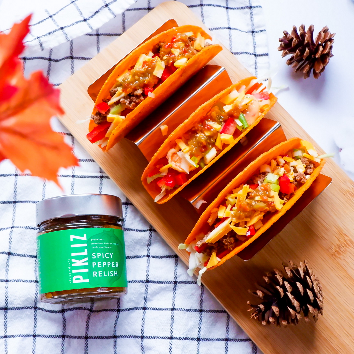 Ingredient 3 taco shells 3 tbsp Alexandra’s Pikliz 1/4 red bell pepper 1/6 cabbage 1/4 cup shredded cheese Protein 100 g grounded beef 5-6 shrimp 2 tbsp olive oil Salt and Pepper to taste Dressing 1 tbsp lime juice 4 tbsp mayonnaise 1 tbsp olive oil 1/2 tsp garlic powder 1/2 tsp cayenne pepper 1 tbsp Alexandra’s Pikliz Spring Onion to garnish Steps In a non-stick pan, put 1 tbsp olive oil. When the pan is hot, put in grounded beef and pan fry until fully cooked, season with salt and pepper, reserve on the side. In the same pan,...