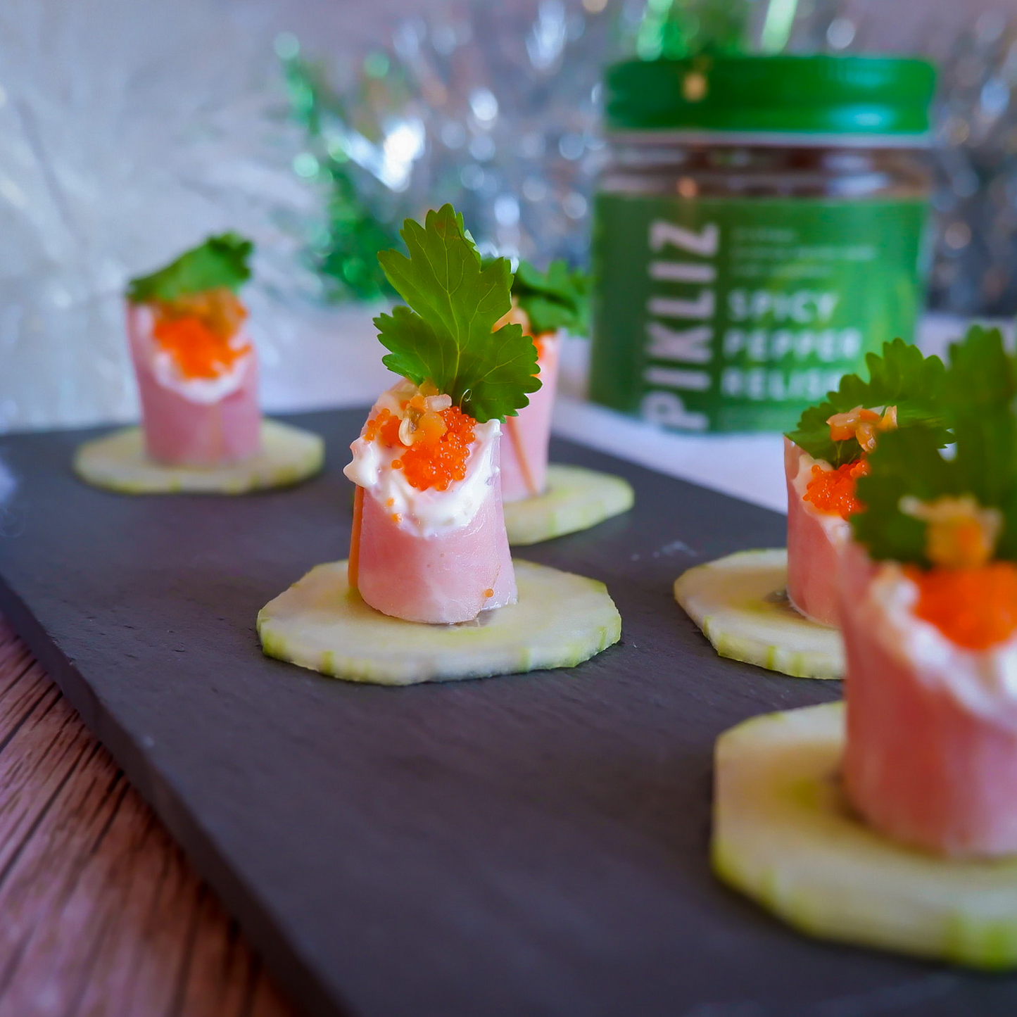 Easy Holiday Ham Roll with Alexandra’s Pikliz   Ingredient Note: For 6 rolls 4 pieces of ham (smoked, maple flavour) 10g Capelin roe 15g cream cheese 5g Alexandra’s Pikliz Cucumber Parsley Steps Mix the cream cheese with the Alexandra’s Pikliz Slice 6 pieces of cucumber. 1 mm in thickness Stack one piece of ham on top of another, with 2 cm displacement Roll the ham with a 1 cm diameter hollow Slice the roll with an angle Repeat 3-5 for the other two pieces of ham Use a small spoon to half fill the roll with the mixture Place proportional...